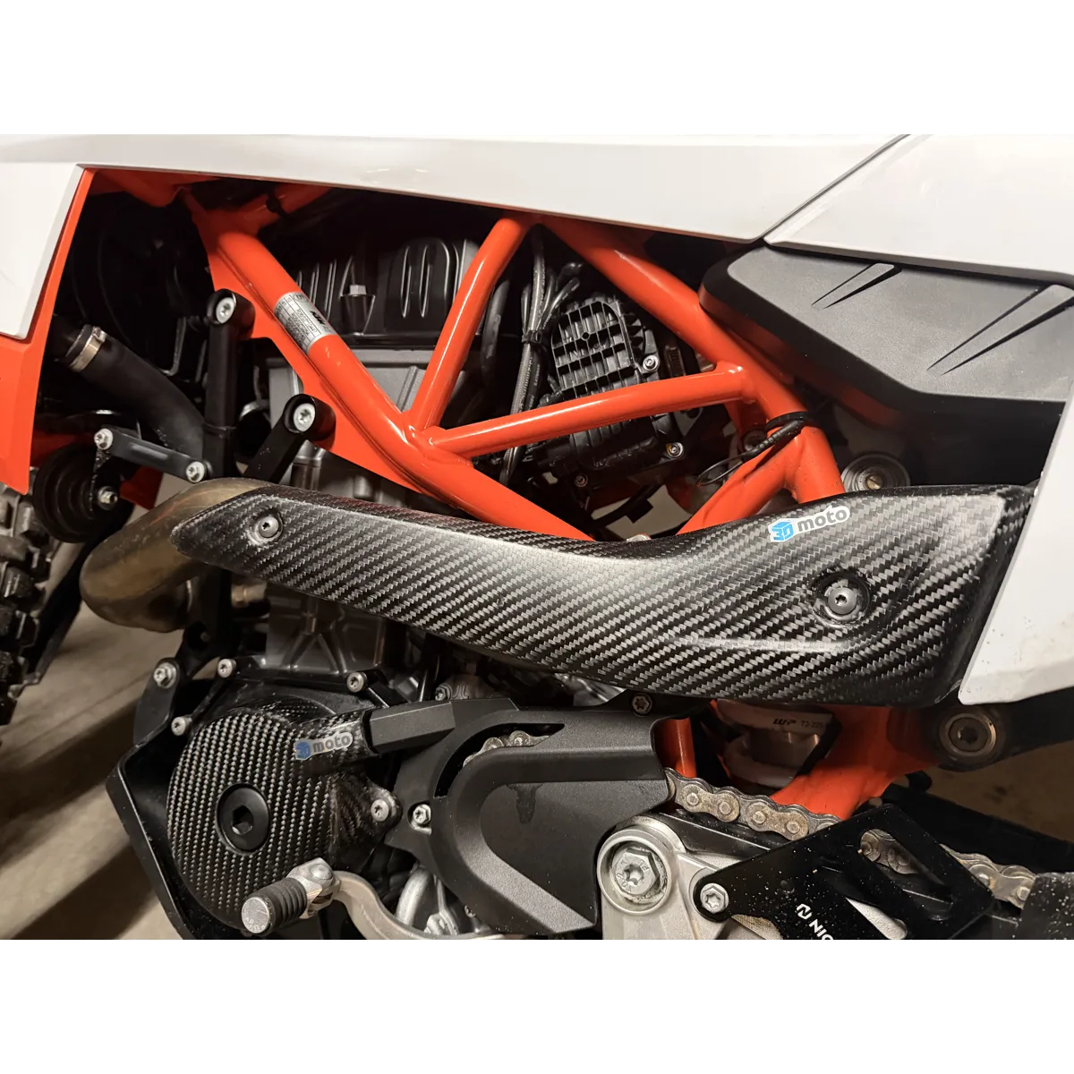 Carbon Fiber Exhaust Heat Shield for 2026+ KTM 690 Enduro/SMC as a replacement of an original, metal heat protector.